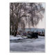 Eine fotografische Schneeszene mit Schmalschiffen auf dem gefrorenen Kanal. Die im Vereinigten Königreich als Schmalboote bekannten Kanalboote wurden ursprünglich zur Beförderung von Gütern im ganzen Land eingesetzt. Sie werden heute hauptsächlich zur Freizeitgestaltung genutzt und ziehen Menschen aus aller Welt an, um unsere ländliche Umgebung zu genießen. Diese Boote sehen sehr hübsch mit ihren hellen Kabinen aus, die traditionell blau, rot oder grün sind. Blume und Schlossdesigns schmücken auch die traditionelleren Boote.