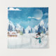 Winterlandschaft im Abend mit schneebedeckten Häusern, Schneemann und Bergen. Weihnachtssammlung