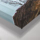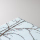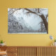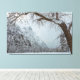 Das Bild zeigt eine ruhige Winterlandschaft mit schneebedeckten Bergen, die teilweise von Nebel verschleiert sind. Ein großer, schneebedeckter Baumzweig, die Arkaden über den oberen Teil des Rahmens, die die Szene umrahmen. Unten erstreckt sich ein Schneefeld, das von schneebedeckten Kiefern gesäumt wird. Die Farbpalette wird von Weiß und Grau dominiert und schafft eine ruhige und kalte Atmosphäre.