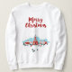 Ein Sweatshirt mit einem digitalen Bild einer bemalten Abbildung einer roten Kirche und Steile. Ein heller Weihnachtsstar, der über der Decke leuchtet. Familien vor dem Haus, die für einen Gottesdienst anreisen. Winterschnee bedeckt den Boden und Erholungen auf niedlichen Buschkiefern. Frohe Weihnachten geschrieben in einem roten trendigen Schriftart.