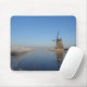 Mousepad mit einer Landschaft in der Landschaft in den Niederlanden im Winter mit einer Windmühle, Eis auf dem Fluss und mattierten Schilfen unter einem klaren blauen Himmel.