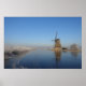 Plakatdruck einer Landschaft in den Niederlanden im Winter mit einer Windmühle, Eis auf dem Fluss und mattierten Schilf unter einem klaren blauen Himmel.