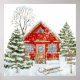 Ein charmantes Design mit festlichem Winterhintergrund mit Tannen und einem roten Haus! Ein niedliches, schönes Winterdesign.