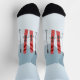 Abstrakte Winterlandschaft mit Panoramablick auf die Berge, rote Skiausrüstung, Pfad und Himmel
