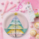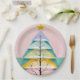 Eine lebendige, stilisierte Komposition, die einen Weihnachtsbaum in einer abstrakten, geschichteten Landschaft darstellt. Das Kunstwerk zeigt einen deutlichen, dunklen zentralen Baumstamm und kahle, schneebestäubte Äste, die sich über horizontale, dreieckige Farbflächen erstrecken. Diese in sanften Pastelltönen von Rosa, Helllila, Türkis und Gold gehaltenen Schichten deuten auf schneebedeckte Terrassen oder eine ätherische Bergkette hin. Ein heller, goldener, fünfzackiger Stern krönt die Spitze. Die Oberfläche hat eine reiche, texturierte Qualität, als ob sie mit dicker Paste oder Gouache gemalt worden wäre. Goldene Akzente heben kleine, leuchtende Kugeln hervor, die über die Äste und innerhalb der farbenfrohen Schichten verstreut sind und festliche Ornamente oder Winterlicht suggerieren