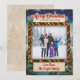 Dies ist eine Weihnachtskarte im Vintage-Stil mit einem festlichen, winterlichen Design. Die Karte zeigt einen schneeblauen Hintergrund, der mit Schneeflocken und immergrünen Zweigen dekoriert ist, wobei der Gruß "Merry Christmas & Happy New Year!" oben in einer klassischen roten Schrift prominent dargestellt ist. Ein zentrales, leicht vertieftes Feld wird von einem kräftigen, gestreiften Rahmen in Rot, Gold und Grün umrahmt, der dazu gedacht ist, ein Familienfoto zu enthalten. Unten auf der Karte befindet sich ein Banner zur Personalisierung.