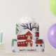 Winterpanda und Bäume Glückliche Feiertage Weihnachtswrapping Papier, dass zeigt einen Panda Bären in Winterkleidung, Bäume, Geschenke und Ziergegenstände.
