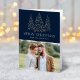 Moderne und elegante Urlaubskarte mit Ihrem Foto, ergänzt durch drei schneebedeckte Imitate mit goldgelben Kiefernbäumen mit mariniertem Hintergrund (bzw. nach Ihren Vorstellungen). "Frohe Weihnachten" wird in einem weißen, modernen Serif-Schriftart mit Ihrem Namen oder benutzerdefinierten Text unten angezeigt. Die Innenseite der gefalteten Ferienkarte enthält Ihre individuelle Nachricht. Auf der Rückseite der Karte befindet sich ein zusätzliches Foto.