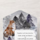 Eine wunderschöne, einladende, waldfarbene Einladung mit von Hand gezogenen, schneebedeckten Kiefern, die braune Kiefernkegel tragen und einen hübschen roten Fuchs bilden, der im Schnee sitzt. Im unteren Drittel befindet sich eine Antwortkarte mit personalisierter uAwg, die Sie abschließen können. Diese sind ideal für Winterfeiern und Feste zum Thema Waldland.