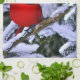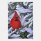 Ein wunderschöner Roter Kardinal, der zwischen schneebedeckten Winterhalbkugeln ruht.