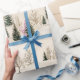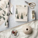 Eine friedliche Winterlandschaft mit schneebedeckten Hügeln mit verstreuten immergrünen Bäumen und Laubbäumen mit nackten Ästen. Schneeflocken fallen sanft ab und schaffen eine weiche, beruhigende Atmosphäre. Die Farbpalette ist in Weiß-, Grau-, Grün- und Brauntönen gehalten.