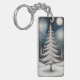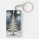 A magical, ethereal winter landscape dominated by a centrally placed, ornate white Christmas tree. The tree features delicate, feathery branches and is sparsely decorated with small, colorful and metallic baubles. It is crowned by a bright, star-like ornament. The scene is set under a dark, dramatic sky where a large, glowing full moon hangs alongside two other luminous orbs. The foreground consists of snowy, undulating hills with intricate, swirling patterns in the snow, and a small, clustered group of rustic dwellings nestled at the tree's base. Tall, spindly fir trees line the background, adding to the moody, enchanted forest atmosphere. The overall feeling is one of quiet, nocturnal wonder and fantasy.