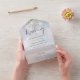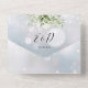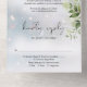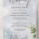 Alles in einem Winter Hochzeitseinladung mit botanischer Vegetation Blumengestalt über elegante Kalligraphie Schrift Typografie auf einem Winterschneeflocken Hintergrund. Die Einladung enthält zusätzliche Gastdetails und eine perforierte RSVP-Karte, die für Sie individuell adressiert oder verlassen werden kann, damit Sie die Adressdaten Ihres Gastes handschreiben können. Entwickelt von Thisisnotme©