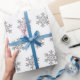 Ein schlichtes silbernes Schneeflockenmuster aus Glitzer und ein weißer Hintergrund zieren dieses Packpapier. Spaß für den Weihnachtsurlaub. Entworfen für Sie von BlackBerry Boulevard.