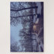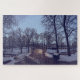 Panoramasicht auf den frühen Abend des schneebedeckten Parks während des Schneesturms mit Straßenbeleuchtung, Kanal und dekorative Brücke