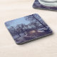 Panoramasicht auf den frühen Abend des schneebedeckten Parks während des Schneesturms mit Straßenbeleuchtung, Kanal und dekorative Brücke