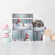 Ein Schneemann mit einem roten Hut und Schal steht neben einem kleinen, auch warm gekleideten Hasen, umgeben von einer schneebedeckten Landschaft mit sanftem Schneefall