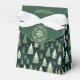 Raffinierte, saisonale Produkttasche für Bäcker oder Bäckereien zum Verpacken von Kleinartikeln wie handwerkliche Pralinen und Mini-Süßspeisen. Winterwald mit Schneeflocken auf einem waldgrünen Hintergrund. Fügen Sie Ihren Firmennamen und Produktnamen oder Ihre Urlaubsnachricht und Ihren Familiennamen hinzu.