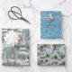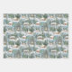 Dies ist ein Set von 3 aufeinander abgestimmten rustikalen Waldhühnerblättern: 1 Blatt mit einem Muster gemütlicher Hütten, eingebettet in den Schneewald; 1 Blatt mit einem Muster von winzigen weißen Schneeflocken auf blauem Aquarellhintergrund; und 1 Blatt mit einem Muster immergrüner Äste, Kiefernkegel und roten heiligen Beeren auf einem winterlich blauen, verschneiten Hintergrund.