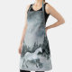 Winterwaldlandschaft mit Nachthimmel und glänzenden weißen Pferden.