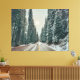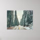 Eine gerade asphaltierte Straße erstreckt sich in die Ferne, flankiert von mächtigen, schneebedeckten immergrünen Bäumen. Die Straße hat eine gelbe Trennlinie in der Mitte. Der Himmel ist bedeckt, mit einer diffusen Sonne, die kaum durch die Wolken sichtbar ist. Schnee ist an den Seiten der Straße und an den Ästen der Bäume sichtbar. Die Szene erinnert an ein Gefühl von ruhiger Einsamkeit und Winterschönheit.
