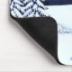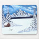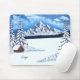 Ein Mauspad mit einer schönen Winterszene, einschließlich schneebedeckter Berge, rustikaler Hütte und schneebedeckter immergrüner Bäume. Das Bild und der Text können personalisiert werden. Originelle Kunst von W.B.