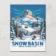 Eine farbenfrohe Abbildung einer verschneiten Landschaft im Skigebiet Snow Basin im Ogden, Utah. Zwei Skifahrer genießen die Pisten, während andere mit dem Sessellift den Berg hinauf fahren.
