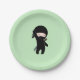 Happy Cartoon Ninja in Schwarz gekleidet mit Arm erhöht in Wellen. Traditionelles japanisches Schwert Katana ist über seiner Schulter befestigt.