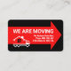 Ein schwarzer Cover weist einen großen roten Pfeil inmitten der Vorwärtsbewegung auf, der LKW-Zuhause folgt dahinter. Oben steht die Überschrift "WE ARE MOVING", die Sie neben den Kontaktdaten ändern können. Auf der Rückseite, in einem weißen Umschlag, sind Details auf der rechten Seite der Karte. Ein goldenes "Zuhause-Landschaft" Logo, das Sie verwenden können, steht oben. Danach folgen die Beschriftung "UNSERE NEUE LAGE", die Kontaktdaten und eine zusätzliche Beschriftung für Sie, um den Umzug zu veröffentlichen. Eine großartige Karte für Sie, um für jeden bevorstehenden Zug zu verwenden.