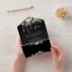 Eine Hochzeitseinladung mit hübschen Saitenlichtern, Blumengrün und eleganter Typografie auf schwarzem Hintergrund. Die Einladung enthält eine perforierte RSVP-Karte mit QR-Code. Entwickelt von Thisisnotme©