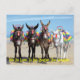 Vier niedliche Esel wartete am Strand, um zu reiten "Wir tun Liebe, um am Meer zu sein" . Eine schöne, sonnige Postkarte, um sie zu sammeln oder an einen Freund zu schicken.