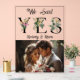 Ein elegantes Hochzeitszeichen mit individuellen Fotos, tropischen Sommerbriefen für "yes" und individualisierbaren Blume für das Ehepaar.