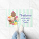 Eine lustige Begrüßungstour mit einem Eis-Thema, das sagt: Wir sind die coolststen. Illustriert mit dem zeichn einer 3-teiligen Eisdecke mit bunten Sprinklen. Eine Eistüte mit Schokolade, Erdbeere und Vanille. Eine Schüssel mit neopolitischem Eis und einer Kirsche auf der Oberseite. Erdbeeren und Ananas stehen neben den Schalen. Summerisch und süß. Ein Muster aus Pfefferminzgrün und Weiß im Hintergrund.