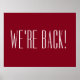 Ein einfaches, aber feines rotes Plakat, das Staaten "WIR’RE BACK" für ein Unternehmen, eine Organisation oder eine Gruppe darstellen, die vorübergehend geschlossen wurde. Ein großartiges Poster, das in einem Schaufenster platziert werden kann, um jedem lassen, dass er wieder im Geschäft ist.