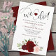 Diese schöne, schicke Hochzeitseinladung mit handgemalten Rose in Rot-, Bordeaux- und Rosa-Tönen, Eukalyptus-Blätter und Gartengrün. Die Überschrift ist in extravaganter Schrift geschrieben und lautet: We Do! mit einem niedlich bordeauxfarbenen Herz dazwischen. Diese Einladung ist die perfekte Kombination aus Moderne und Zeitlos - sowohl romantisch als auch skurril - macht sie zu einem idealen Ort für eine feierliche oder lässige Zeremonie.