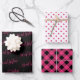 Chic Packpapier-Blätter für ein 16 . Geburtstag-Fest mit drei passenden Mustern. 16 . Geburtstag in einem Wirblen Skript in heißen Rosa gegen Schwarz geschrieben. Ein Blatt mit heißen rosa Polka Punkten auf weißem Hintergrund. Und rosa und schwarz kariert.
