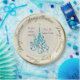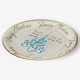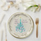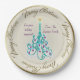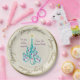 Schöne Papiertafel mit einem originalen digitalen Bild von Leslie Sigal Javorek eines Wirbel türkisfarbenen Weihnachtsbaumes mit violetten Ornamenten auf einem Trompe L'oeil (Trick of the eye) Hintergrund Illusion von feinkörniger Knochen-China und mehr Tiefe. 2 benutzerdefinierte Textfelder, um den Teller für ein großartiges Geschenk zu personalisieren.