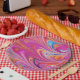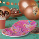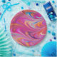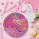 Papier Teller mit einem coolen trippy psychedelischen Design. Rosa, Orange und blaue Farbtöne, die sich alle umkreisen. Retro Hippie Vibe.