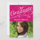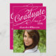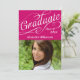 Hellrosa fuchsia Hintergrund mit weißem Wirblen gürteligen Skript-Text mit "graduate", und ein benutzerdefiniertes Jahr, großartig für den Absolvent, um die große Leistung anzukündigen. Feiern Sie auf der Rückseite mit eigenem Veranstaltungstext für Ihre Gäste. Alle Designs Copyright © www.CustomInvitesOnline.com