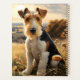 Ein Planer mit einer Szene eines Wire Hair Fox Terrier, der im Herbst auf einem Hügel zwischen Blume auf dem Land sitzt. Dieser Planer wird bestimmt jeden begeistern, der Wire Hair Fox Terriers Liebe hat.