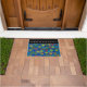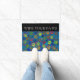 Eine bunte Fußmatte, damit Katzeninhaber Besuchern Tatzen für Gedanken mit einem Muster der Katzentatze druckt in den Losen verschiedenen Farben einschließlich Rotes, Orange, Grünes, Gelbes und Braunes, auf einem blauen Hintergrund geben. Ist oben der Auftrag "Abwischen Ihre Tatzen" in der weißen Beschriftung auf einer schwarzen Platte. Sie können den Slogan, den Schriftart und blaue die Hintergrundfarbe zum Anzug mit dem besonders anfertigen Knopf ändern. Die Türmatte würde das perfekte Geschenk für ein neues Zuhause oder einen Housewarming für katzenartige liebevolle Freunde und Familie sein.