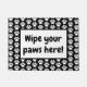 Niedliche Begleiter-Matte mit den Worten Wischen Sie hier Ihre Pfoten. Schwarz-Weiß-Pfoten-Druckmuster-Hintergrund. Sie können den Text anpassen, wenn Sie möchten.