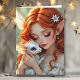 A birthday card for any girl or woman. On the front is a beautiful red haired fairy holding her ittle white dragon with purple chibi eyes. Inside it wishing someone a magical birthday and also has a surprise coloring page.