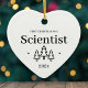 Erste Weihnachten als wissenschaftliches Herz-Ornament für einen neuen Job. Elegante Porzellan Keramik Urlaubsornamente in Weiß mit schwarzer Schrift. Mit Weihnachtsbäumen und Sternen.