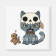 Angry looking cat with tattoo markings, bone necklace, and a skull on top of its head is sitting beside a voodoo doll with pins.