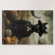 This whimsical Halloween artwork features a stylish black cat dressed as a Victorian witch, surrounded by a quirky array of jack-o'-lanterns under a surreal autumn sky. A perfect blend of spooky and charming, this fantasy print is ideal for Halloween lovers, gothic decor fans, and anyone who enjoys magical realism with a feline twist.