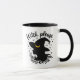 A beautiful witch in black with the moon in color and all other elements in black and white.