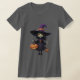 A sinister Halloween witch with wild, tangled black hair and piercing yellow eyes holds two carved jack-o'-lanterns in her clawed hands, their flickering candlelight casting eerie shadows across her wicked grin. Her face is twisted with mischief, her mouth curled into a malevolent smirk, and her pointed hat tilts slightly as she leans forward, as if plotting something devious. She wears a tattered, dark-purple dress with spiderweb lace.