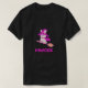 Der T - Shirt weist ein Logo mit einem stilisierten Tiercharakter auf, das eine Kombination aus Maus und Geist zu sein scheint. Der Charakter trägt einen Hexenhut und fährt einen Besenstiel. Die Farbgebung ist vorwiegend lila und rosa. Unter dem Zeichen steht Text, der "PAUCEK" in fett gedruckten Großbuchstaben, gefolgt von "GHOST ANIMAL" in kleineren Großbuchstaben ausliest.