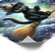 Dieser skurrile Aquarelldruck zeichnet sich durch eine fröhliche Hexenkatze aus, die auf einer Broomstick-Fahrt herauskommt.